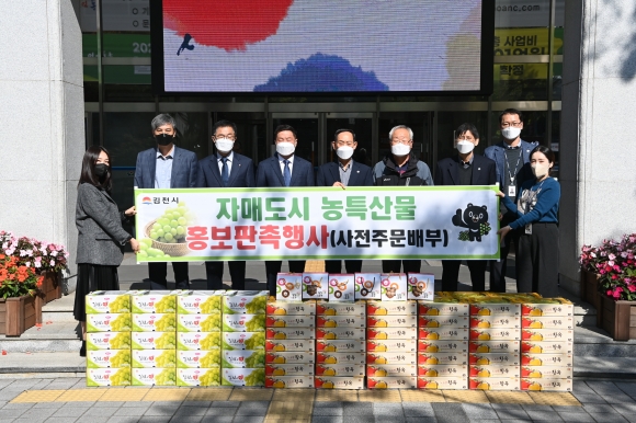 | 김천시(시장 김충섭)는 10월 20일(수), 21일(목) 자매도시인 대구 동구청과 부산 영도구청을 방문하여 농특산물 홍보·판촉행사를 진행했다. 이날 행사는 코로나 19의 영향으로 사전주문을 통한 최소인원만 참석하여 현장전달 배부했으며, 택배 배송을 통한 비대면 홍보도 함께 추진했다.
