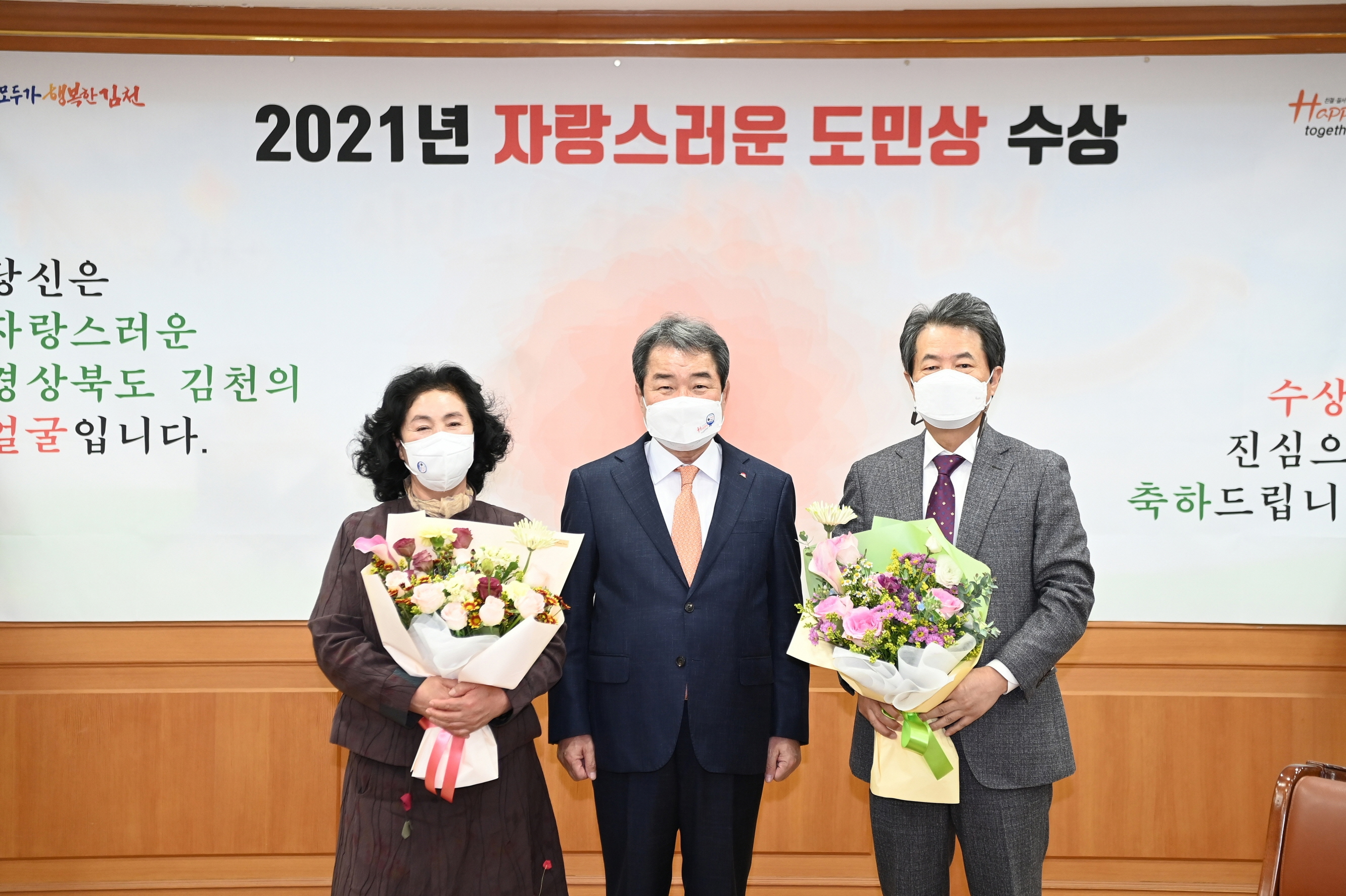 | 김천시(시장 김충섭)는 지난 22일 경북도청 화백당에서 진행된‘2021년 자랑스러운 도민상 시상식'에서 김천제일병원 강병직 이사장, 대도중공업(주) 백계자 대표이사가 ‘2021년 자랑스러운 경북도민상'을 수상했다고 밝혔다. 강병직 김천제일병원 이사장은 지역의료 발전에 중요한 역할을 담당하면서 시민 건강증진 향상에 기여한 공로, 김천시종합자원봉사센터 활동을 통한 지역사회 공헌, 백계자 대도중공업(주) 대표이사는 대민봉사와 시민통합 및 지역화합에 대한 공로를 인정받아 지역사회발전 부분에서 수상했으며,