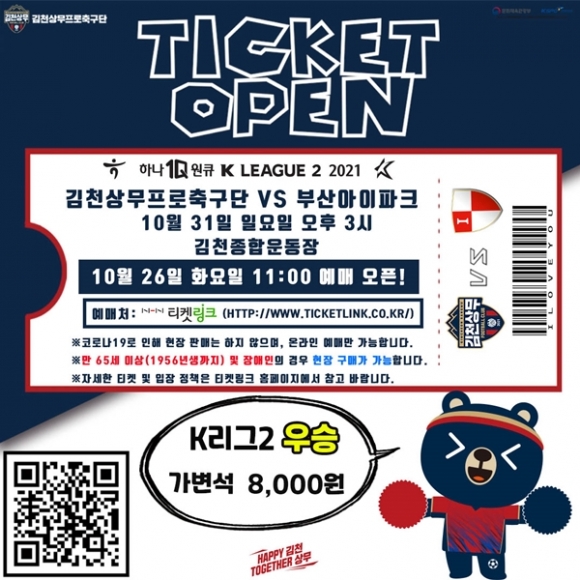 김천상무프로축구단(대표이사 배낙호)이 26일 오전 11시, 온라인 예매 사이트 티켓링크를 통해 31일 오후 3시 김천종합운동장에서 열리는 ‘하나원큐 K리그2 2021’ 36R 마지막 경기인 부산아이파크와 홈경기 온라인 예매를 시작한다.
