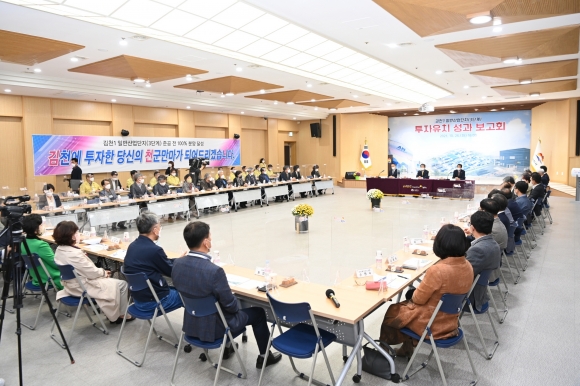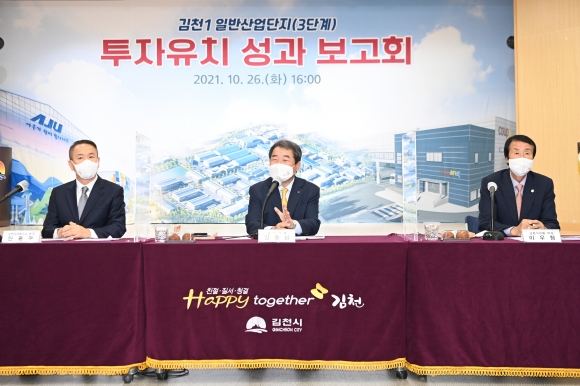 | 김천시(시장 김충섭)는 지난 10월 26일 시청3층 강당에서 김충섭 시장과 김천시의회 이우청 의장, 김천상공회의소 안용우 회장을 비롯한 경제계 및 주요 사회단체장들이 참석한 가운데 김천일반산단(3단계) 투자유치 성과보고회를 개최했다.
