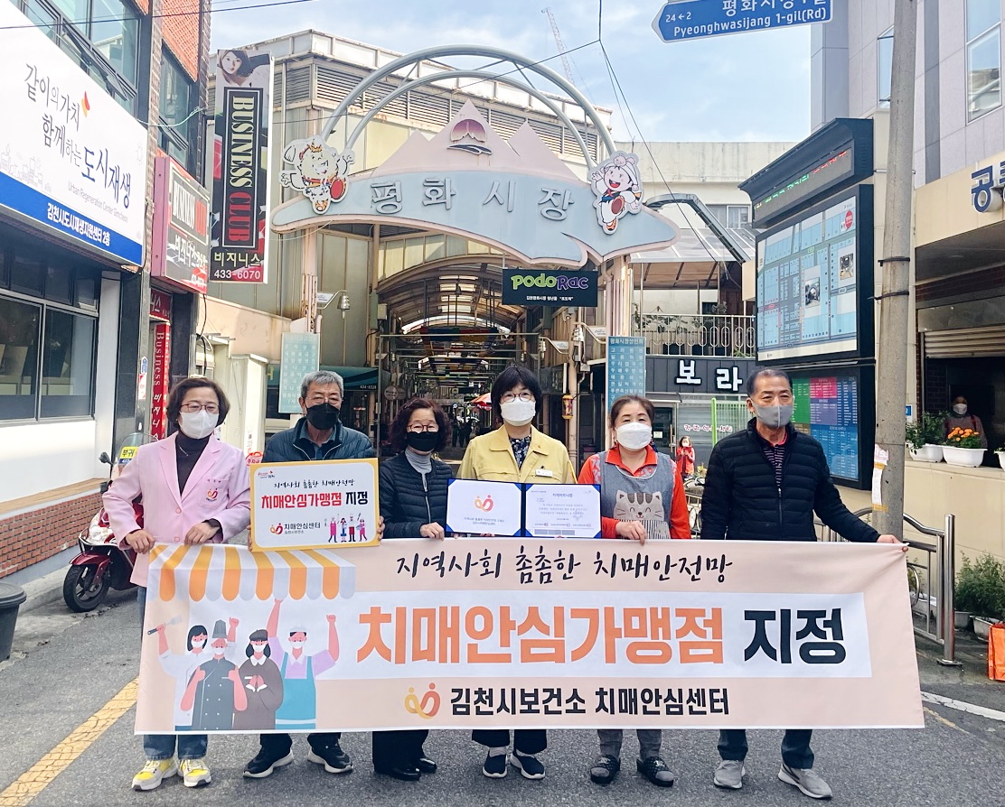| 김천시치매안심센터는 치매안전망 구축으로 치매 친화적인 환경을 조성하기 위해 개인사업장 35곳을‘치매안심가맹점’으로 지정했다고 26일 밝혔다. 이번에 지정된 치매안심가맹점은 지역주민들이 많이 이용하는 전통시장(평화시장) 15곳(만평식육점, 대우과일상회, 김천미샤점, 흥부청과, DC클럽할인매장, 비주얼리, 길카페, 왕자범표고무, 유정순대국밥, 이시은헤어숍, 헤어클리닉선희, 은혜떡기름방, 윤가네, 새까치분식, 두배루반점, 부귀식당)을 지정하였으며, 치매정보를 얻을 수 있는 의원 및 약국 3곳(김천신경정신건강의원, 율곡내과의원, 수온누리약국), 보건복지부와 BGF리테일이 체결한‘치매환자 실종예방 업무협약’에 따른 CU편의점 2곳(CU김천황산로점, CU김천로제니아점), 치매환자와 보호자 가족들이 체험을 할 수 있는 농촌교육농장 1곳(마고촌), 신규 치매안심마을로 지정된 대곡동 30통 내 3곳(금탑 식육유통, 고원식육점, 마블링베이커리), 자발적 참여 사업장 11곳(시래기와막걸리, 육감만족, 예반, 등촌샤브칼국수, 와촌식육식당, 오거리슈퍼, 뚜레쥬르, 세진베이커리 & 카페, 뚱스, 헤어클리닉선희)이다.