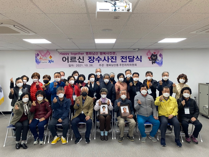 이번 장수사진은 2021년 주민자치센터 활성화 공모 사업으로 선정된 「Happy together 평화남산 행복사진관」 사업의 일환으로 9월 한 달 동안 관내 어르신 50분을 대상으로 촬영했으며, 보정과 인화를 마친 장수사진을 액자에 담아 통장협의회(회장 허은)의 협조를 받아 어르신 댁에 직접 방문하여 전달했다.