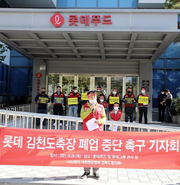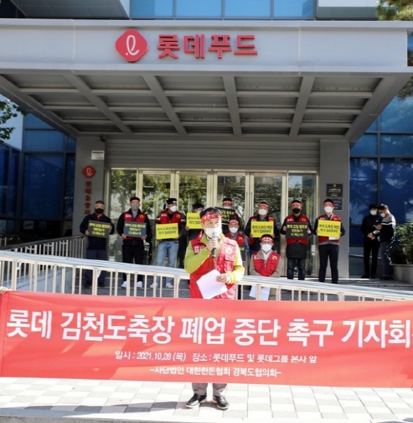 |  | | | ⓒ 김천내일신문 | | 세계일보10월30일자에 따르면 대한한돈협회(회장 하태식)는 지난 28일 서울 영등포구 롯데푸드 본사와 잠실 롯데그룹 본사 앞에서 잇따라 '김천 롯데 도축장 폐업 철회 생존권쟁취 기자회견'을 열고 "롯데푸드 도축장 폐업으로 경북 지역 120여 양돈농가에서 출하되는 일평균 1500두의 돼지들이 하루아침에 출하처를 잃게 됐다"며 피해를 호소했다. 하태식 대한한돈협회 회장은 이날 "경북 김천의 거점도축장 롯데푸드가 12월 31일을 끝으로 육가공 및 도축사업을 중단한다고 한돈농가에 통보했다"라면서 “올해말 도축장이 폐쇄될 경우, 수년간 롯데를 신뢰하고 생돈공급계약을 체결한 농가에서는 아무런 대책 없이 거래처를 상실, 지급률 하락, 도축능력 저하 등으로 해당 지역 한돈농가에 막대한 타격을 줄 수밖에 없다며, 일방적인 폐업을 철회할 것”을 촉구했다. 또한 경북지역 한돈농가 대표로 참석한 한돈협회 정태주 이사는 기자회견문을 통해 "도축장 및 육가공장은 대한민국 농축산업소득의 40%를 차지하는 축산업의 바탕을 이루는 기간산업으로 롯데 김천 도축장·육가공장이 작업을 멈출 시 경북지역 경제 타격과 손실 발생이 불가피한 상황"이라고 강조했다. 이날 경북지역 한돈농가들은 “롯데푸드에 도축장 폐업을 2년 유예하고, 그마저도 불가능하다면 타 기업에 임대나 매각해줄 것을 요청했다. 한돈협회는 "롯데는 상생의 정신으로 아프리카돼지열병(ASF)이 안정화될 때까지 2년간 폐업을 유예해줄 것을 촉구한다"고 밝혔다.