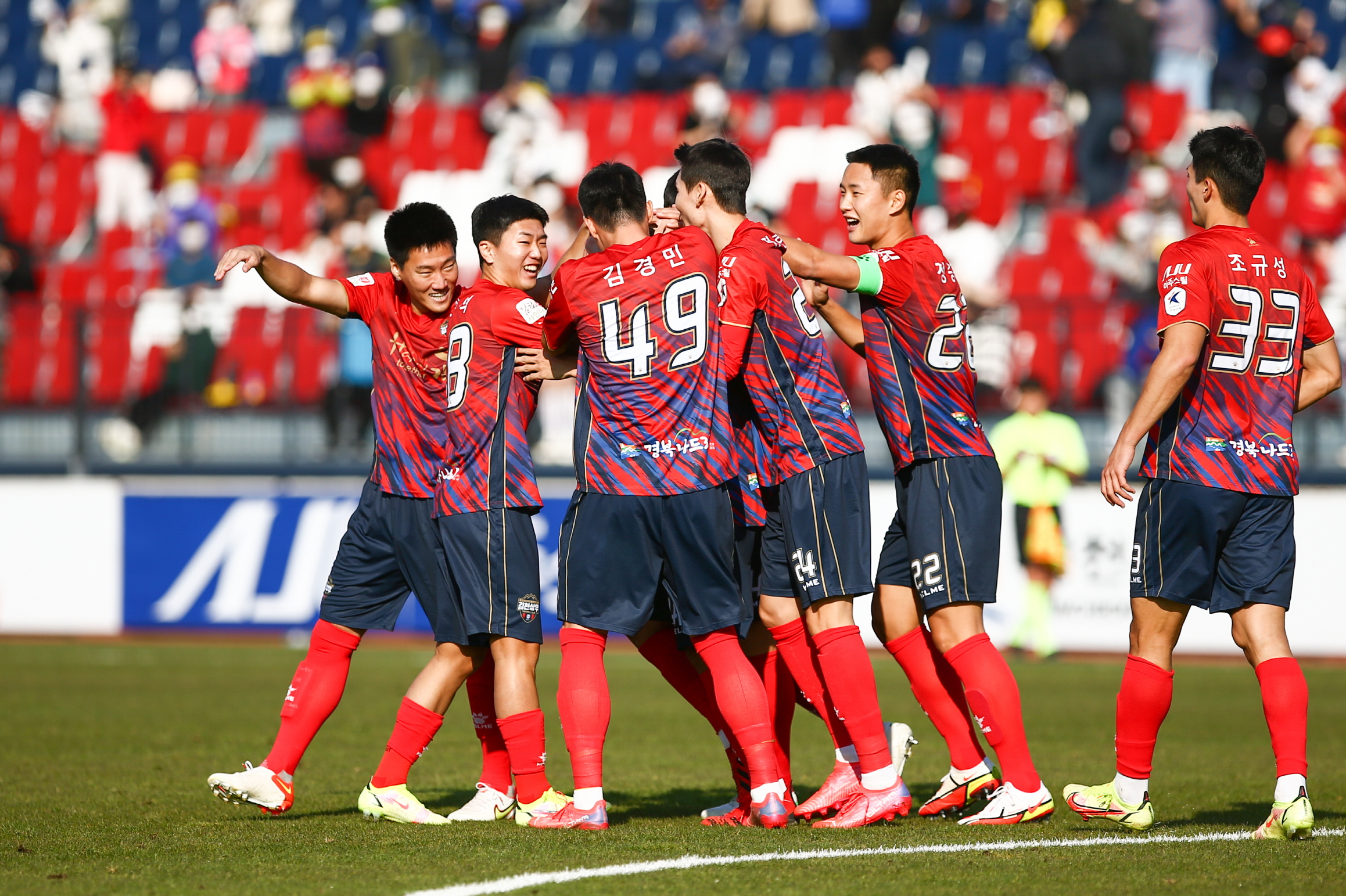 전반 시작과 함께 김천은 선취골을 뽑아냈다. 전반 2분, 고승범의 코너킥 상황에서 한찬희가 헤더 득점을 터뜨리며 1대 0으로 앞섰다. 양 팀의 치열한 공방전이 계속됐지만 추가골 역시 김천의 몫이었다. 전반 24분, 심상민의 패스를 받은 조규성이 드리블 끝에 득점포를 터뜨리며 2대 0.