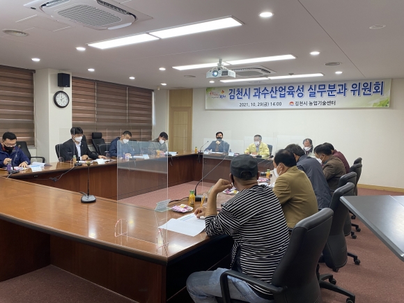 | 김천시는 지난 29일 김천시농업기술센터 세미나실에서 2022년도 FTA과수고품질 시설현대화사업 추진을 위한 세부사업별 주요안건에 대한 단가조정 등을 위한 과수산업육성 실무분과위원회를 개최하여 총5개 품목 54개 사업을 확정했다. 이날 심의회에서 세부사업 단가결정 및 변경사항에 대해 논의한 결과 올해 추진해 온 포도, 자두, 사과, 배, 복숭아 5개 품목 53개 세부사업 중 친환경과원관리(GAP)는 사업시행지침 상 지원조건이 종료되어 제외하고, 서리 및 저온 피해방지를 위한 열풍방상팬, 복숭아 수형고정 및 가지 찢어짐 방지를 위한 유인지주시설을 추가 지원하기로 결정했다.