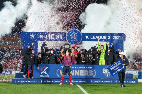 | 조기우승 및 승격을 달성한 K리그2 챔피언 김천상무의 1년을 숫자로 되짚어보자. 1, K리그2 최종 순위 2021년 36경기를 치른 김천은 정규리그 2경기를 남기고 일찌감치 K리그2 우승을 차지하며 2022 시즌 K리그1으로의 승격을 확정지었다. 7,8월 치열한 1위 다툼 끝에 8월 23일 부산 원정에서 승리하며 1위를 굳힌 김천은 이후 2달 여 반 간 한 번도 다른 팀에 선두를 내주지 않았다.