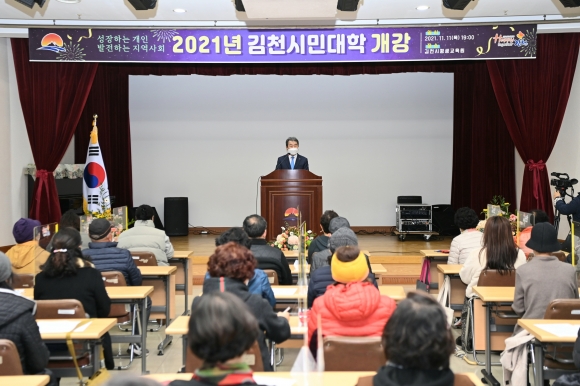 | 김천시평생교육원에서는 11월 11일(목) 90여 명이 참석한 가운데『2021년 김천시민대학』개강식을 가졌다. 직장인들의 참여를 높이기 위해 매년 저녁시간에 운영해 온 김천시민대학은 퇴근 후 만나는 평생학습으로 시민들에게 배움의 즐거움을 안겨주고 있으며, 특히 지난해 코로나19로 운영하지 못한 터라 유난히 뜨거운 관심 속에 개강하게 되었다.