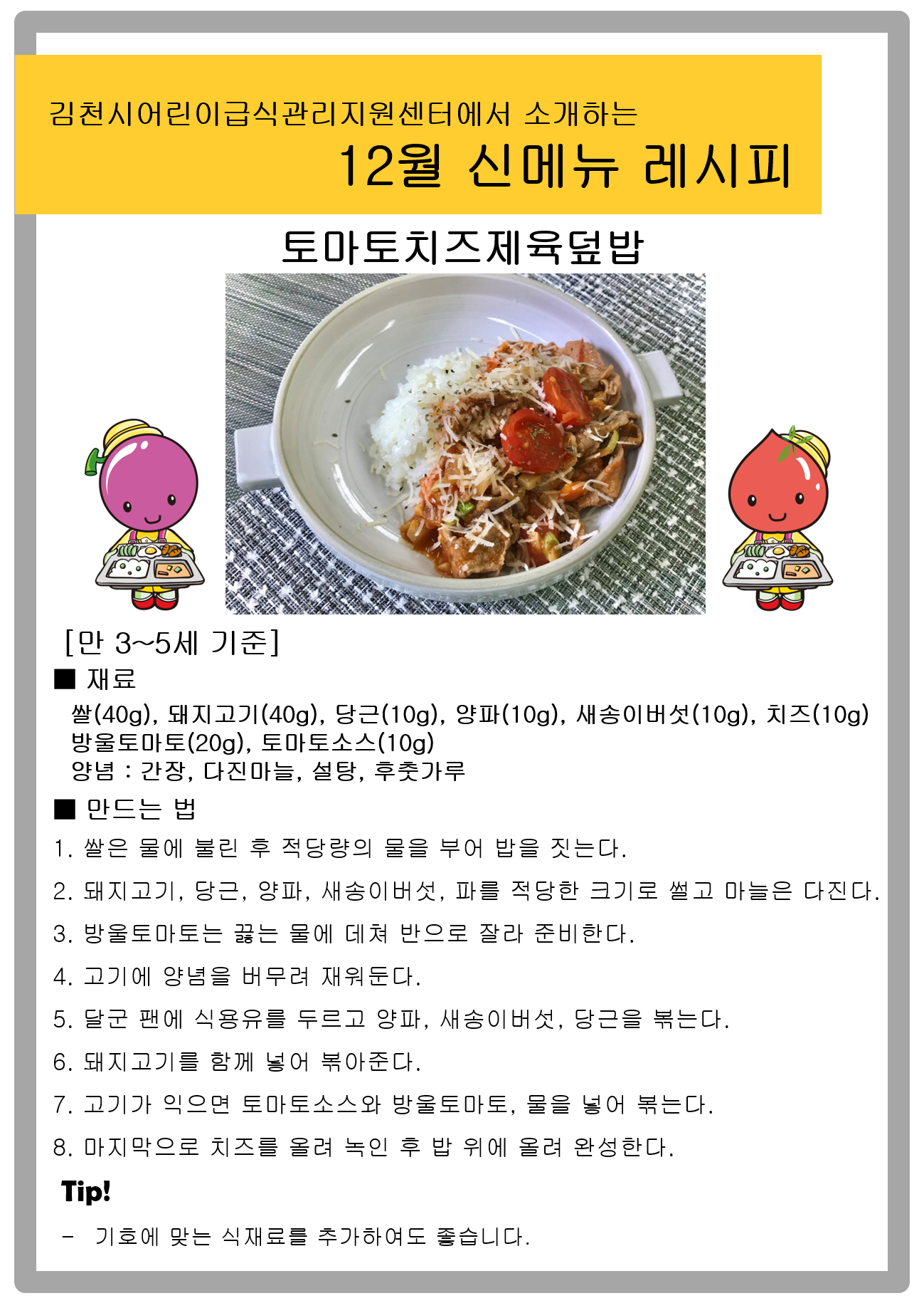 | 김천시 어린이급식관리지원센터에서는 코로나-19로 인한 사회적 거리두기인 시기에 가정에서 활용할 수 있도록 매달 제공되는 식단의 신메뉴 레시피를 영상으로 제작하여 제공하고 있다. 이번 12월 식단의 신메뉴 레시피는 ‘토마토치즈제육덮밥’ 이다.