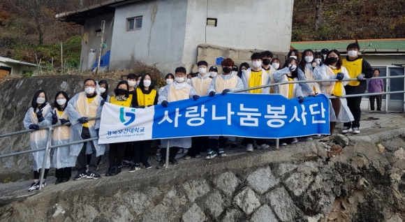 | 경북보건대학교(총장 이은직) 사랑나눔 봉사단은 지난 11월 19일 김천 관내 고래실길, 내촌2길, 백옥길, 삼애2길, 솟골길, 감문로, 신음새동네1길 등 지역사회 소외계층을 대상으로 사랑의 연탄배달 봉사를 실시하였다.