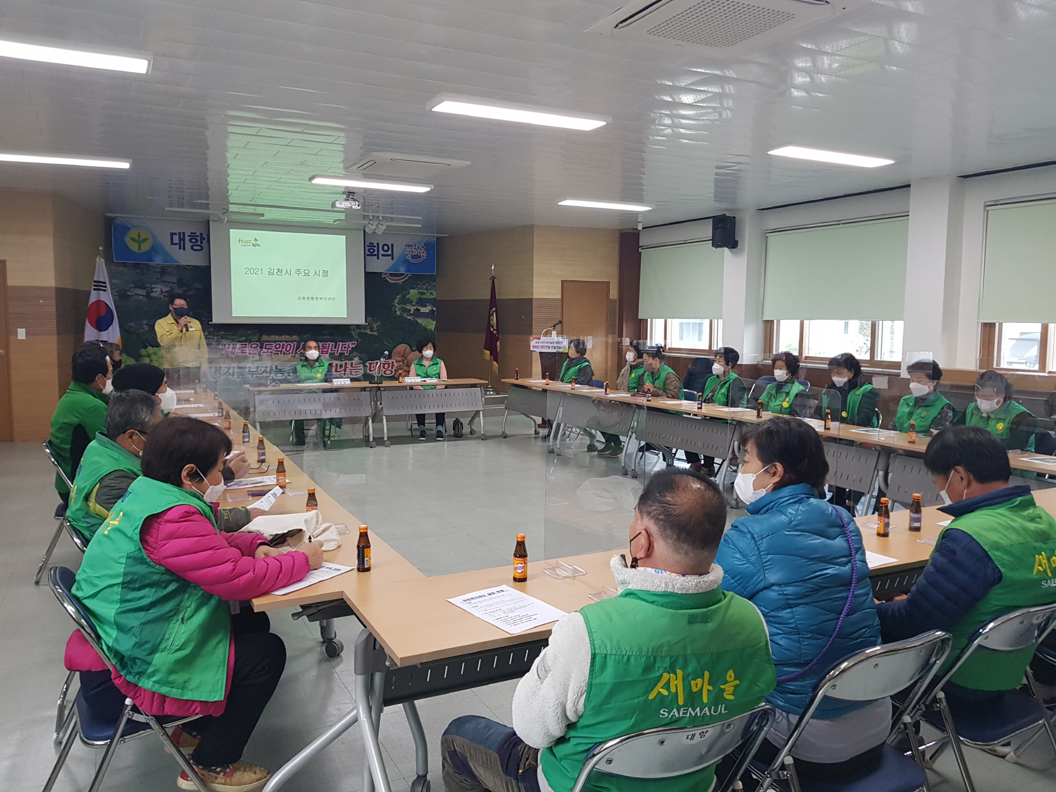 새마을지도자 안기수 총무 사회로 진행된 이번 회의는 먼저 면장님의 인사말씀과 면 자체 제작한 홍보물로 2021 공모사업 선정 현황과 곧 준공될 김천공공산후조리원, 노인건강센터, 청소년 문화의 집 등에 대해 소개하고 기업유치 현황을 홍보했다. 이어서 한 해 동안 적극적인 봉사정신으로 지역의 발전을 위해 노력한 회원들의 노고를 치하하고 2021년 새마을활동을 되돌아보며 남은 사업들의 추진도 논의했다.