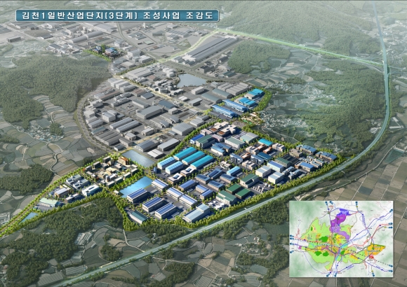 김천 일반산업단지(3단계)는 사통팔달 국토의 중심이라는 지리의 이점을 이용해 35만평(1156천㎡) 규모로 김천에서 직접 개발한 공영개발로 1841억원을 투입했다.