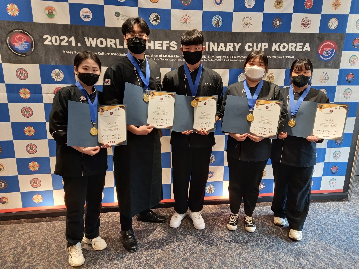지난 11월 5~6일(2일간) 대전 컨벤션센타 전시장에서 열린 “2021 대한민국 월드 셰프 컬리널리 컵 국제 요리대회” 김천대 호텔조리전공 학생들이 단체전에 출전하여 경연부문에서 두 개의 상(라이브5인 3종에서 금상과 단체팀전에서 경기도 의장상)을 수상하는 쾌거를 이루어냈다.