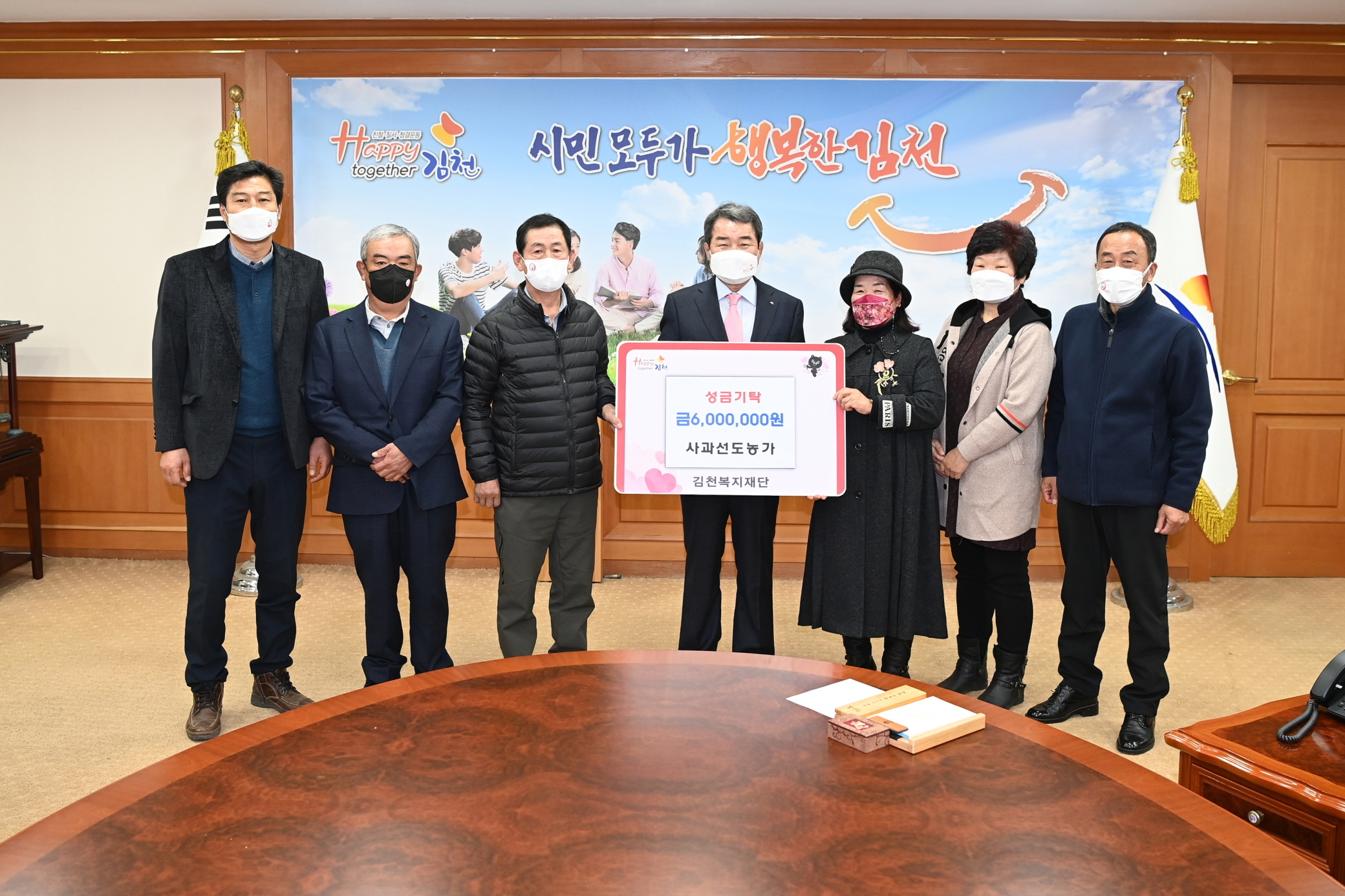 | 김천시 사과선도농가 박병윤 외 5명이 지난 29일 김천시청을 방문해 연말연시 어려운 이웃에게 전달해 달라며 김천시복지재단에 성금 600만원을 전달했다.