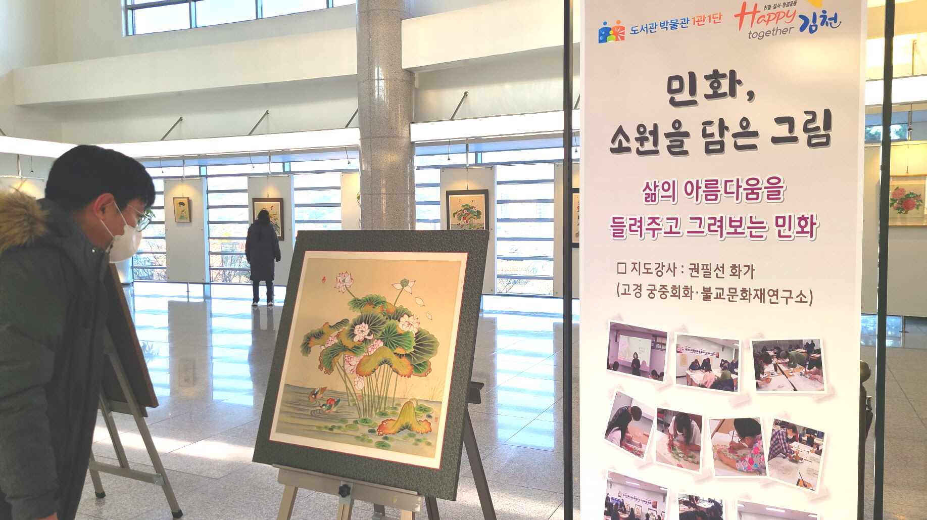 | 김천시립도서관(관장 백선주)에서는 12월 1일부터 12일까지 ‘삶의 아름다움을 들려주고 그려보는 민화’ 2021년 도서관 1관1단 공모사업의 작품 전시회를 개최한다고 밝혔다. 도서관 1관1단 사업은 문화체육관광부에서 주최하고 한국도서관문화진흥원이 주관하는 공모사업으로, 올해 김천시립도서관이 ‘민화’를 주제로 처음으로 선정된 사업이다.