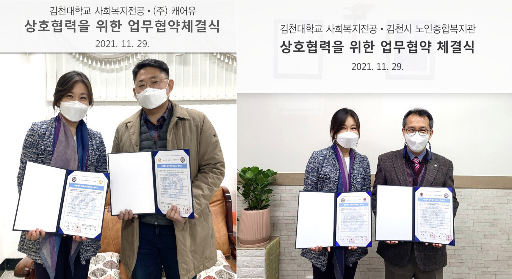 김천대 사회복지전공, ㈜캐어유 • 김천시노인종합복지관과 휴먼서비스 인재양성을 위한 산학연 업무협약체결