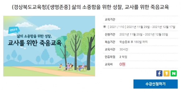 연수 과정은 삶과 생의 마지막 단계에 대한 이해, 상실 경험 이해 및 돌봄과 공감적 소통, 발달 단계별 생명존중 수업사례 등으로 구성했다. 경북교육청은 이번 연수를 통해 교사의 생명존중 역량을 강화함으로써 학교 현장에서 교과와 창의적 체험활동 시간에 학생들이 협력과 배려, 생명존중 의식을 함양하는데 기여할 것으로 기대한다.