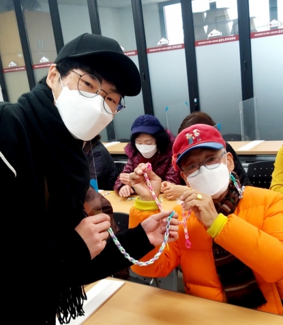 | 김천대학교(총장 윤옥현) 사회복지전공(주임교수 이예종) 학생들은 지역아동센터 아동들과 노인관련 복지기관 어르신을 대상으로 ‘마음잇기 마스크줄 만들기’ 활동을 실시하였다고 3일 밝혔다. 마스크 줄은 하나하나 손으로 고리를 끼워 만드는 형식으로 서로의 마음을 이어 세대 간의 연결을 의미하고 있다.