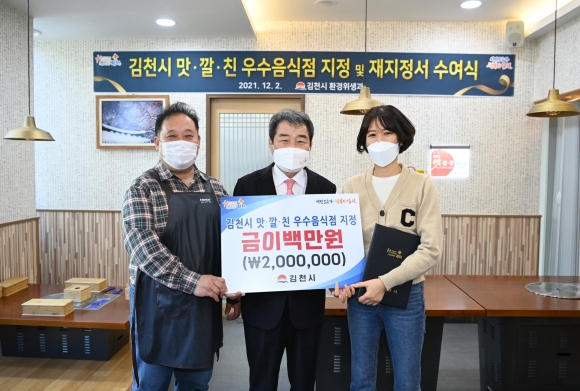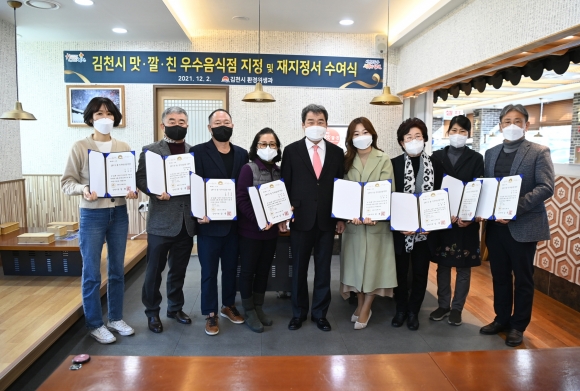 | 김천시(시장 김충섭)는 2021년 하반기 맛깔친 우수음식점 지정증을지난 2일 남면 모산 우미관에서 김천의 맛과 멋을 담고 있으면서 “Happy together 김천” 운동을 모범적으로 실천하는 “김천시 맛·깔·친(맛있고 깔끔하고 친절한 업소) 우수음식점” 2개소 선정과 우수음식점 7개소를 재지정하여 지정서를 수여했다.