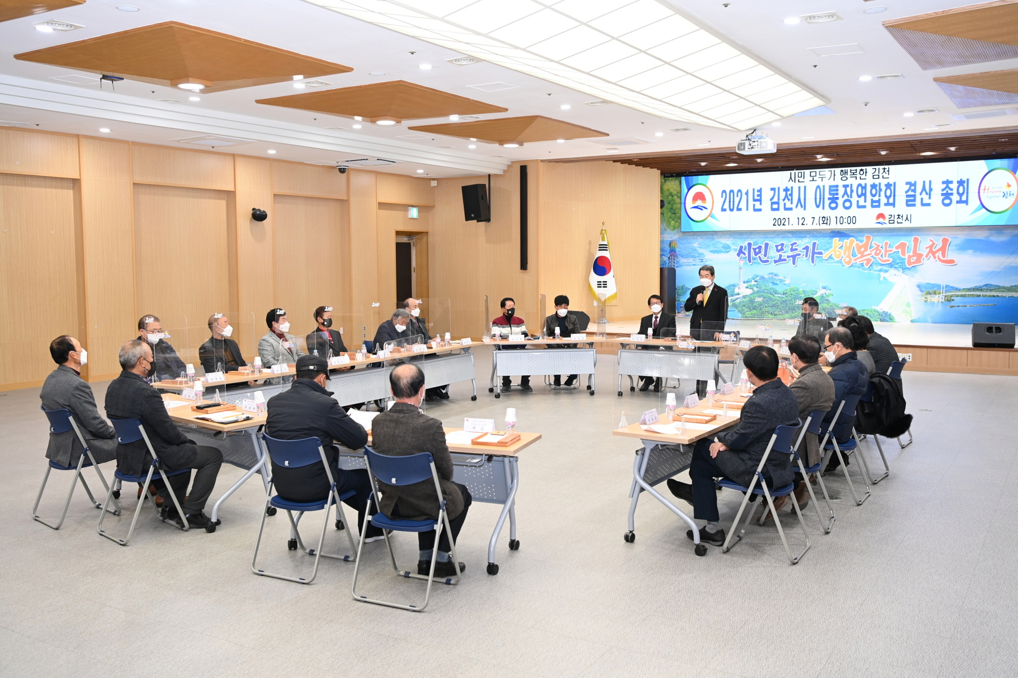 | 김천시 이통장연합회(회장 최상동)는 지난 7일 김천시청 3층 강당에서 코로나19 예방을 위해 가림막 설치, 마스크 착용 등 방역 수칙을 철저히 준수한 가운데 2021년도 결산 총회를 가졌다.