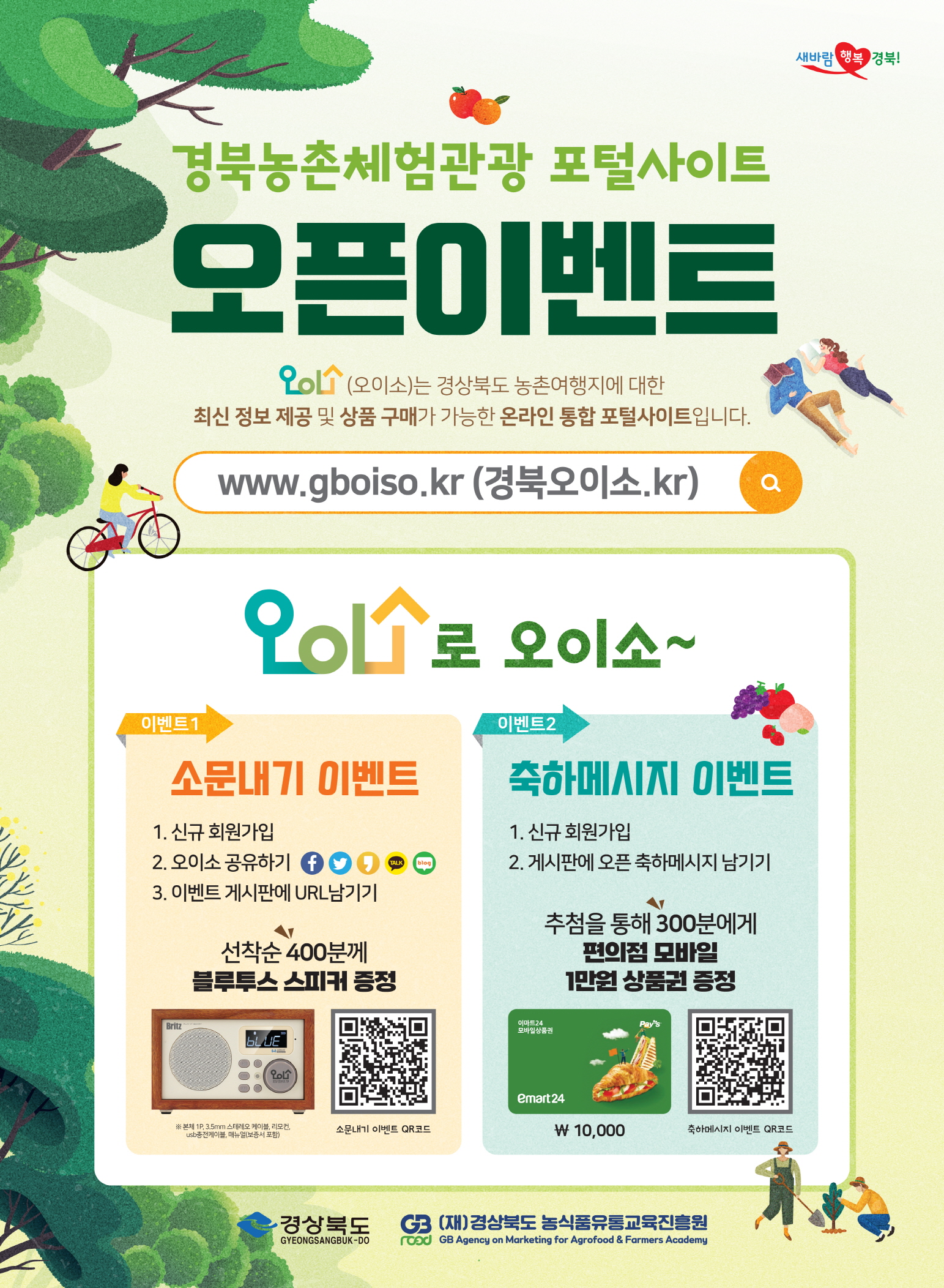 축하 메시지 이벤트 참여 시 300명을 추첨으로 1만원 온라인 상품권도 지급한다. 이벤트에 대한 자세한 사항은 홈페이지 접속 후 이벤트 메뉴를 통해서 확인할 수 있다.(www.경북오이소.kr, www.gboiso.kr) 이철우 경북도지사는 “최근 관광과 여가 생활에 대한 여행 플랫폼의 변화에 발 빠르게 대응하기 위해 이번‘오이소’를 개발하게 됐다”라면서, “그간 잘 알려지지 않은 지역 농촌만의 숨겨진 매력을‘오이소’를 통해 홍보해 농촌체험 관광이 활성화 될 수 있도록 하겠다”라고 말했다. |