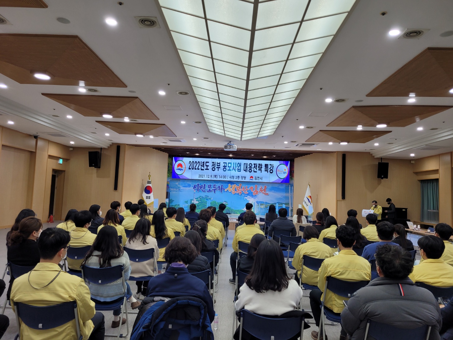| 김천시는 12월 9일 국도비 확보에 보다 체계적이고 전략적으로 대응하기 위해 공모사업 관련부서 팀장 등 약 90명의 직원이 참석한 가운데『2022년도 정부 공모사업 대응전략 특강』을 실시했다. 이번 특강은 경상북도 정책자문관, 김천시 정책자문단 위원장으로도 활동하고 있는 이석희 정책기획연구원장이 진행했다.
