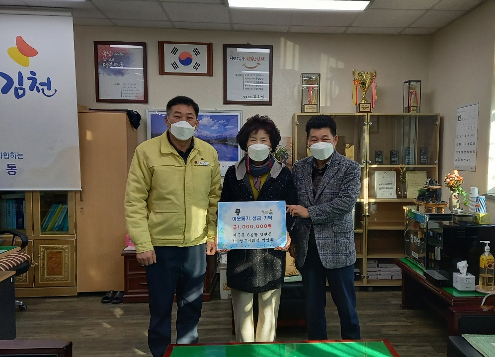 | 코로나19 장기화로 침체된 사회적 분위기 속에서도 성금 기탁을 통해 이웃 사랑을 실천하는 사례가 이어지고 있어 주민들의 마음을 따뜻하게 하고 있다. 대곡동 6통 김현곤 통장과 박명희 새마을부녀회장은 성금 1백만 원을 전달하며 ⌜희망 2022 나눔캠페인⌟에 동참했다.