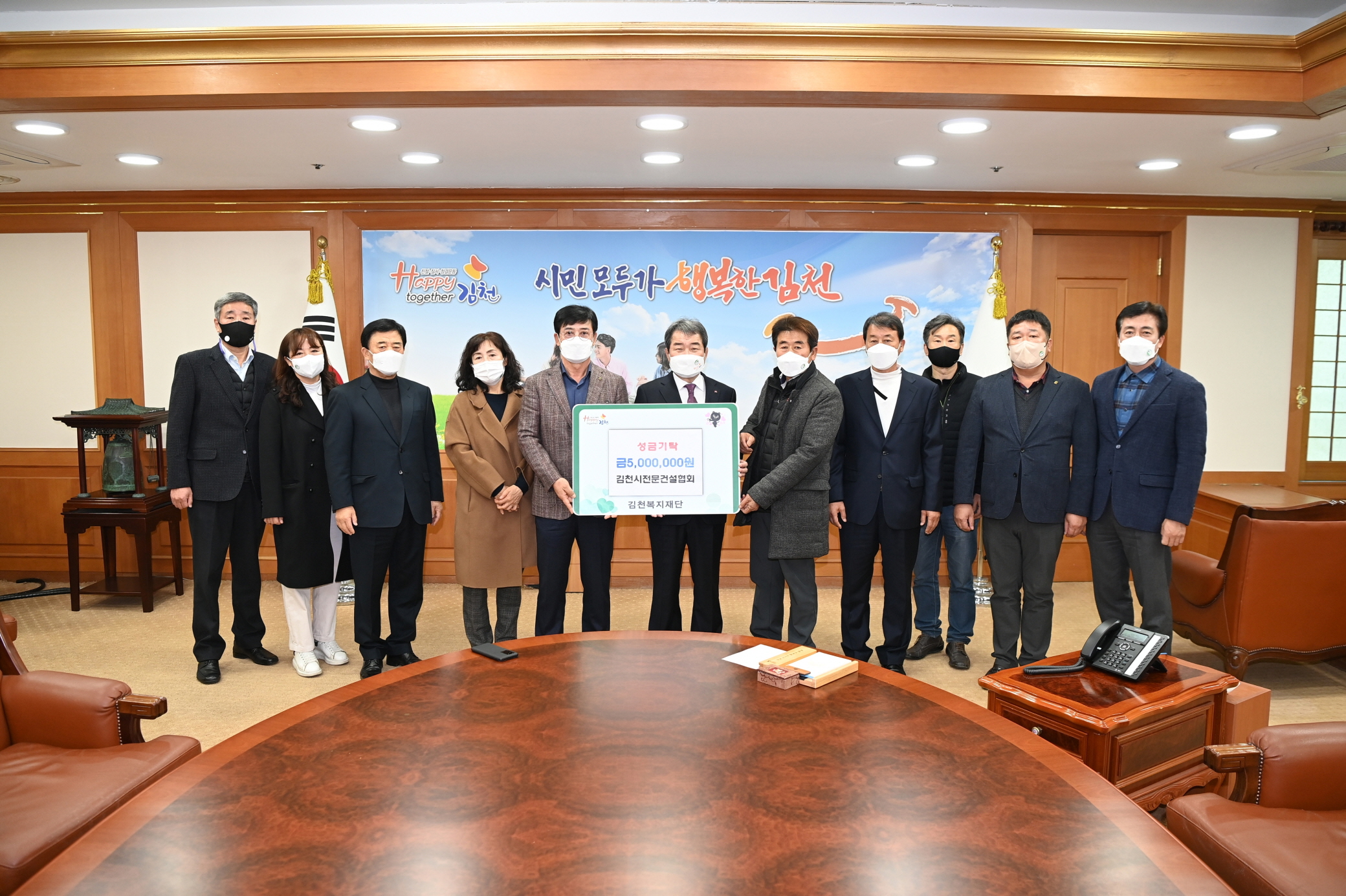 | 김천시전문건설협회(회장 김석조)는 지난 12월 09일(목) 김천복지재단에 성금 오백만원을 기탁했다. 김천시전문건설협회는 매년 우리 주변의 불우이웃을 위해 성금을 단체와 개별 회원사별로 기탁해 오고 있다. 금년 2년째 지속되는 코로나 – 19 바이러스로 인해 많은 기업들과 독지가들이 어려움을 겪고 있지만 김천시전문건설협회는 올해도 따뜻한 도움의 손길을 나누고 있다.