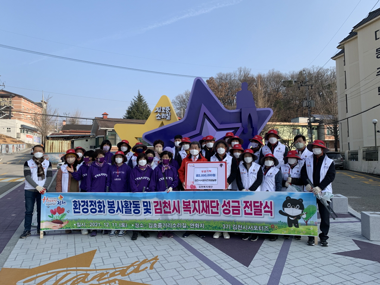 이 날 김호중 소리길에서 진행된 성금 전달식 후 김천시 서포터즈 회원들 40여명은 최근 관광객이 많이 찾고 있는 김호중 소리길에서부터 연화지 주변 일대에 산재 되어 있는 생활 쓰레기를 수거하는 환경정화 봉사활동을 함께 진행했다.