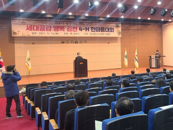 | 김천시 4-H본부(회장 최정호)와 4-H연합회(회장 박민혁)는 지난 12월 14일 김천시농업기술센터 농업인교육관에서 김천시4-H본부/김천시4-H연합회, 지도교사 및 학교 4H회원들이 한자리에 모인 가운데 『세대공감 행복김천 4-H한마음대회』를 개최했으며, 김충섭 김천시장, 이우청 김천시의회 의장, 역대 4-H본부 회장 등 내빈이 참석하여 자리를 빛냈다.