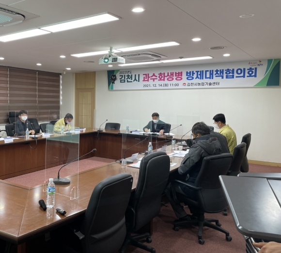 | 김천시(시장 김충섭)는 지난 14일 농업기술센터에서 2022년도 과수화상병 방제 계획 협의와 농약선정을 위한 과수화상병 방제대책협의회를 개최했다.
