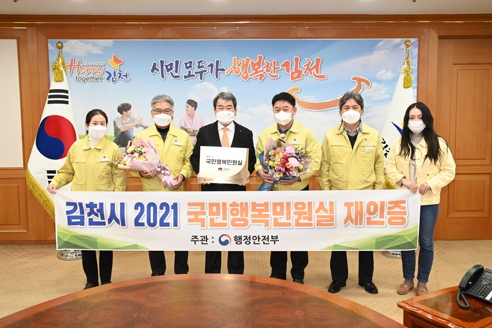 김천시는 지난 2018년 최초 인증을 받은 뒤 2021년에도 경상북도 내 유일하게 재인증 기관으로 선정되어 2024년까지 효력이 연장됐다. 김천시 열린민원과는 시민편의를 위한 happy together 현장민원실 운영과 친절한 민원서비스 제공을 위한 민원안내 자원봉사단 운영, 사회적 약자 전용창구 설치와 북카페 및 수유실 설치 등 최상의 민원서비스 환경을 조성했다. 또한, 민원공무원의 안전한 근무환경을 위한 비상벨 설치, 민원공무원의 스트레스 이완과 역량 강화를 위한 민원공무원 힐링교육 등을 실시하여 양질의 행정서비스 제공에 노력했다.