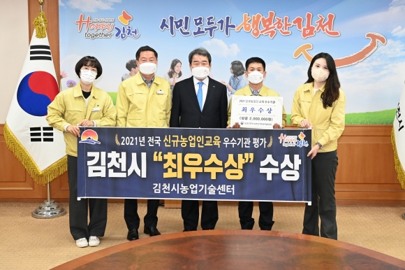 | 김천시농업기술센터는 지난 11월 18일 농촌진흥청에서 주관한 전국단위 ‘2021년 신규농업인 교육 우수기관 발표경진’에서 최우수상을 수상했다.
