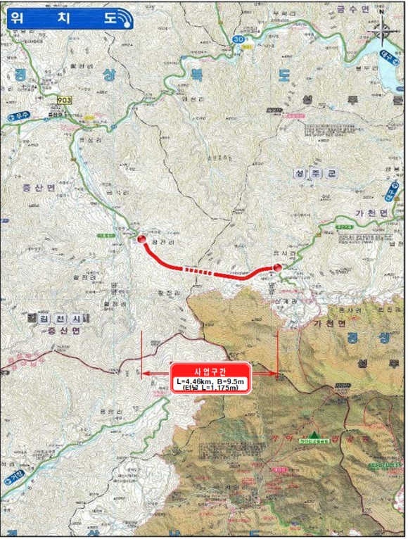 - 터널개통으로 5km기존 35km → 5km(단축 30km) 운행시간 6분내로 - - 2022년도 성주군 지방도 905호선 금산-칠선 등 5개사업 추진 -