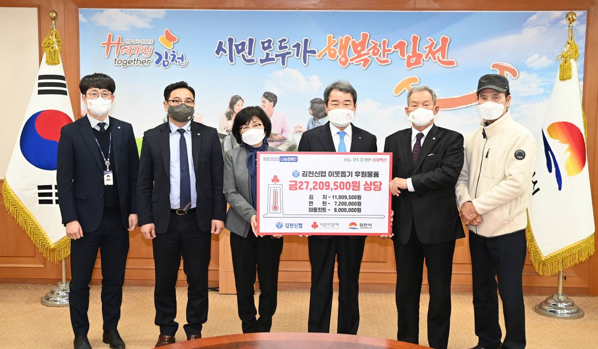 3만원 상당의 아동키트(과자 등) 300박스는 저소득층과 관내 아동시설에 지원되었으며, 연탄 10,000장은 저소득층 50가구에 200장씩 배달되었다. 더불어 김천신협에서는 자체 봉사단 등의 참여자들과 김장 행사로 담근 뜻깊은 김치(6kg)를 저소득층 400가구에 전했다.