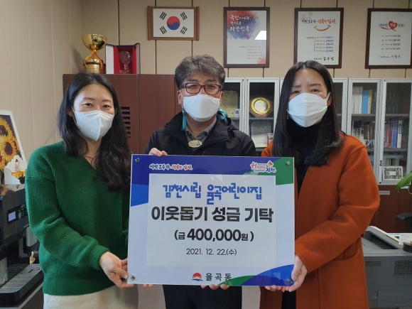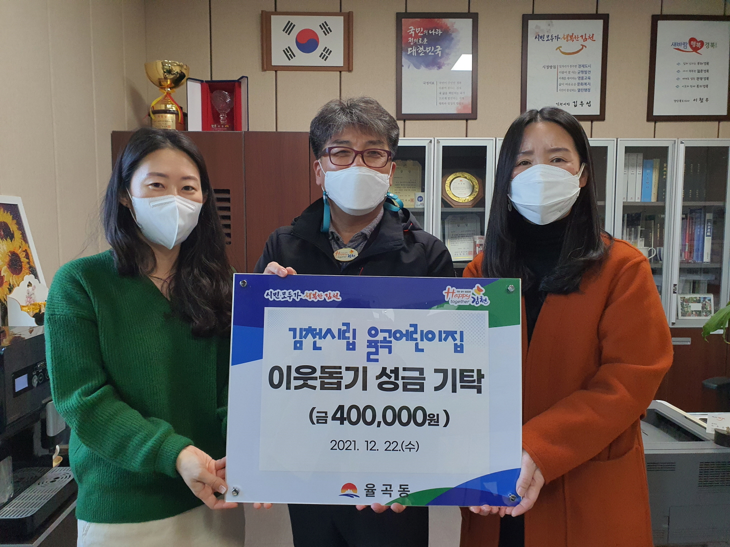 | 김천시 율곡동행정복지센터(동장 이우문)에서는 22일 율곡동 소재 김천시립 율곡어린이집(원장 조경희)으로부터 이웃돕기 성금을 기탁받았다고 밝혔다.