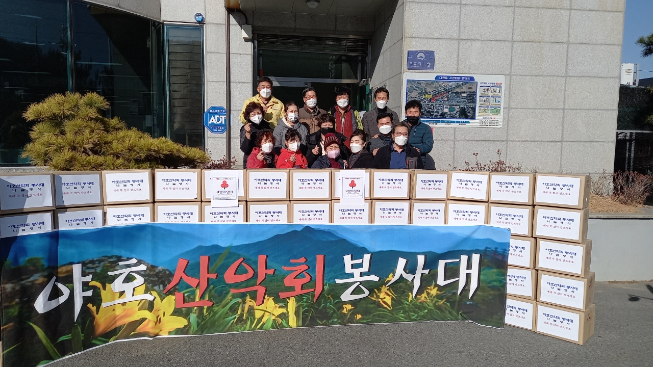 | 지난 22일 야호산악회봉사대(회장 임종만)는 대곡동 행정복지센터를 방문하여 동절기 관내 어려운 가정에 전달해 달라며 반찬, 떡, 라면, 김, 계란 등이 담긴 식료품 100박스를 기탁했다.