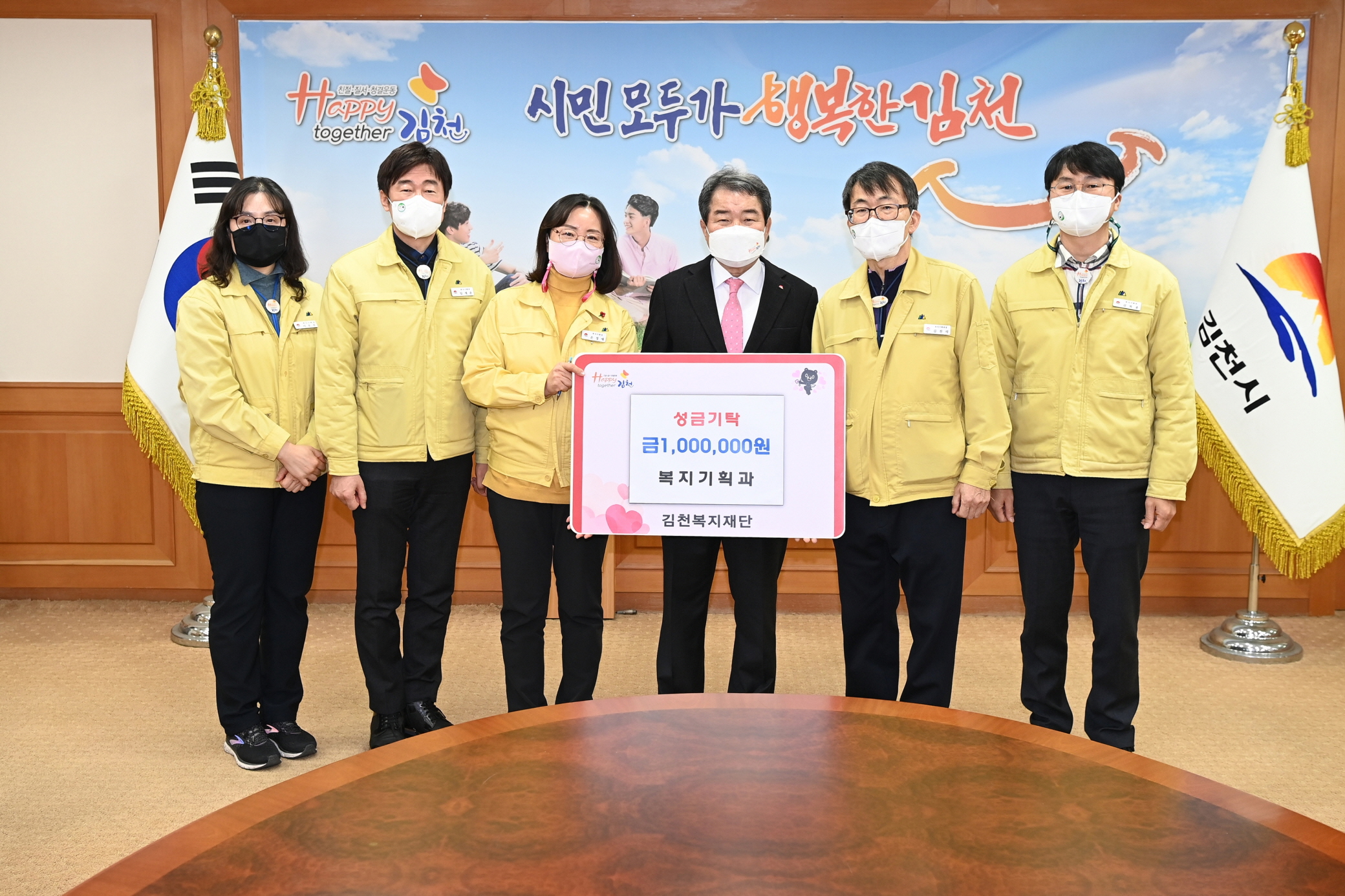 이날 기부된 성금은 김천시 복지기획과에서 2021년도 신규시책평가에서 받은 시상금을 의미 있는 곳에 사용하자는 직원들의 뜻을 모아 나눔에 참여했다. 김천시관계자는 “올 한 해 동안 열심히 일한 공로를 인정받아 수상한 시상금을 이웃돕기에 동참하게 되어 기쁘고, 함께 해준 직원들에게 감사하다. 작은 금액이지만 어려운 이웃들에게 조금이라도 도움이 되었으면 좋겠다.”고 했다.