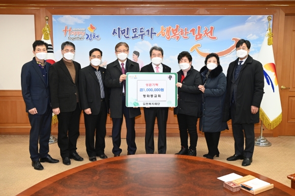 평화동교회에서는 연말을 맞아 어려운 이웃에게 따뜻한 온기를 전달하기 위해 복지재단으로 이웃돕기 성금 100만원을 전달했다. 전달식에 참석한 김명섭 목사는 “코로나19와 추운날씨로 지친 이웃들에게 도움이 되길 바라는 마음으로 신도들과 뜻을 모아 김천복지재단 성금기탁에 동참하게 되었다. 앞으로도 지역사회와 이웃을 위해 나눔과 봉사를 적극적으로 실천하겠다.”고 말했다.