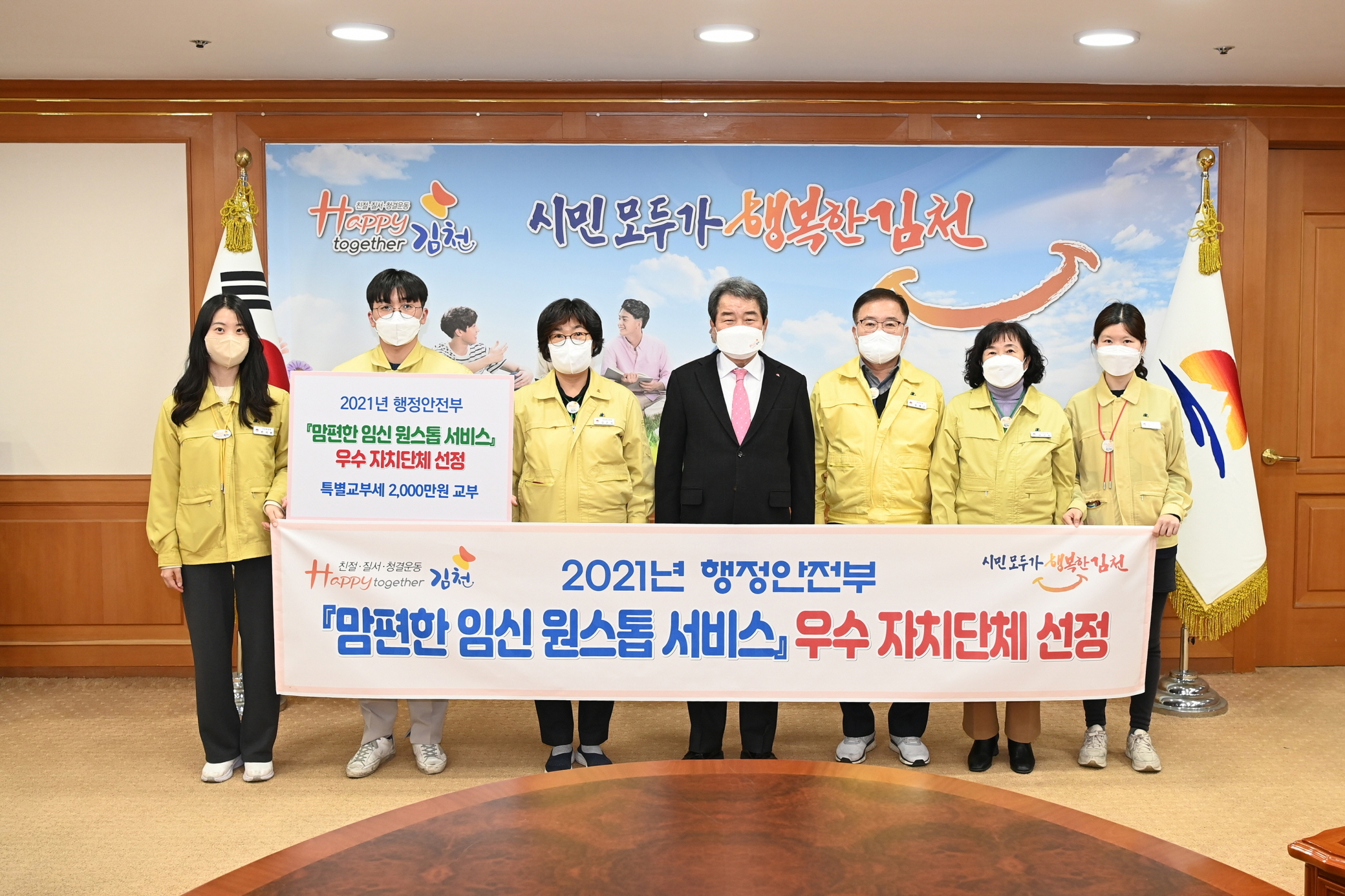 | 김천시는 행정안전부에서 주관하는 ‘2021년 맘편한 임신 원스톱서비스’평가에서 우수자치단체로 선정되어 특별교부세 2,000만원을 지원 받게 되었다.