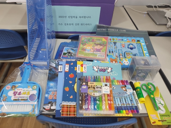 | 지난 23일 김호중 팬클럽 김천 위드아리스(리더 위춘희)에서 초등학교 입학 예정인 드림스타트 아동 16명에게 학용품(100만원 상당)을 후원 했다.