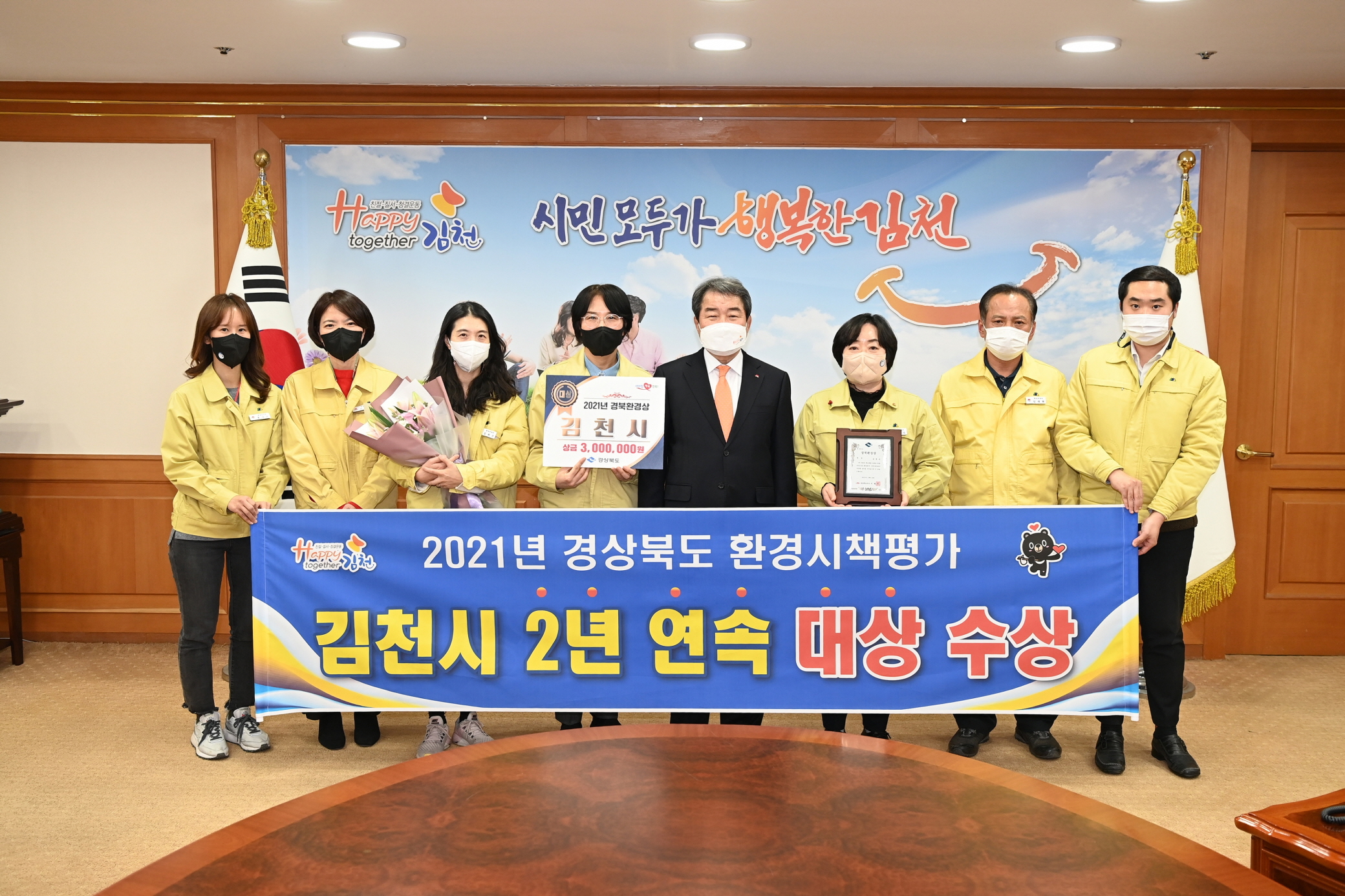 | 김천시(시장 김충섭)는 지난 24일 경상북도에서 열린‘2021년도 경북 환경상’시상식에서 『대상』을 수상하는 영예를 안았다. 특히 김천시는 지난해에 이어 2년 연속 대상 수상의 쾌거를 이뤘다. 경북 환경상은 매년 환경 분야 업무추진 실적, 특수시책, 우수사례 등을 종합 평가해 우수 시·군을 선정, 수상과 인센티브를 수여하는 환경 분야 도내 최고로 권위 있는 상이다.