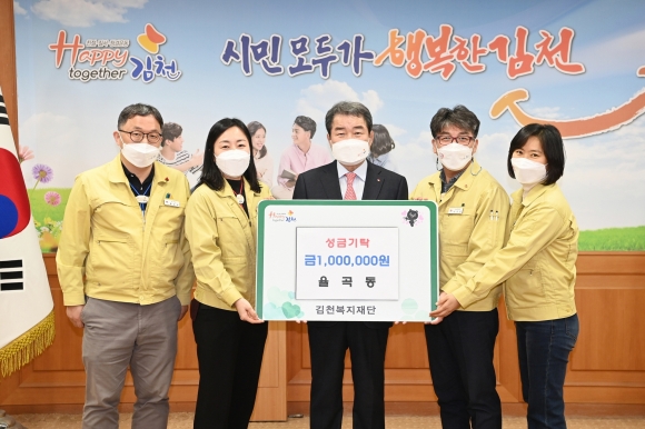 | 김천시 율곡동행정복지센터(동장 이우문) 직원들은 27일 시청 접견실에서 경상북도 새마을운동 읍면동 평가, 『Happy together 김천』운동 평가 등 각종평가에서 우수한 성적을 거두어 받은 시상금 중 100만원을 김천복지재단에 기탁했다. 율곡동행정복지센터는 올해 관내 단체와 손잡고 아이스팩 재활용사업, EM 발효액 보급사업, 2대가 함께하는 자연보호 활동 등 다양한 신규 시책을 내실있게 추진한 결과 경상북도 새마을운동 읍면동 평가 우수상(1위), 김천시청 인구종합평가 최우수상, 시정홍보 최우수상, 『Happy together 김천』운동 최우수상, 신규시책 평가대회 우수상, 읍면동 자치행정 종합평가 장려상을 수상하며 괄목할만한 성과를 거두었다.