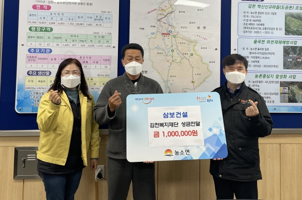 | 삼보건설(사장 김종용)은 지난 28일 연말을 맞아 소외되고 어려운 이웃을 위해 김천복지재단에 성금 100만원을 전달했다.