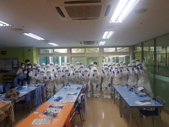 | 김천제일병원에서는 코로나 극복을 위한 프로젝트의 일환으로 직원과 지역대학 간호학과 학생들을 대상으로 방역복 착탈의와 보호장구의 착용방법에 대한 교육을 대대적으로 시행하였다. 이날 교육은 적정진료관리부 감염관리실과 감염교육간호사들이 함께 방역복의 종류와 기능, 착용과 탈의 방법, 주의사항을 강의하고 직접 방역복과 보호장구를 착용하며 직원과 학생간 서로 점검하는 시간을 가졌다.