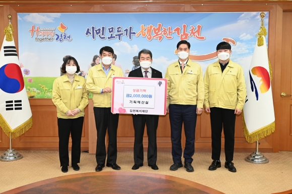 | 김천시 기획예산실에서는 30일 지역사회복지 증진을 위해 김천복지재단에 2백만 원의 기부금을 전달했다.