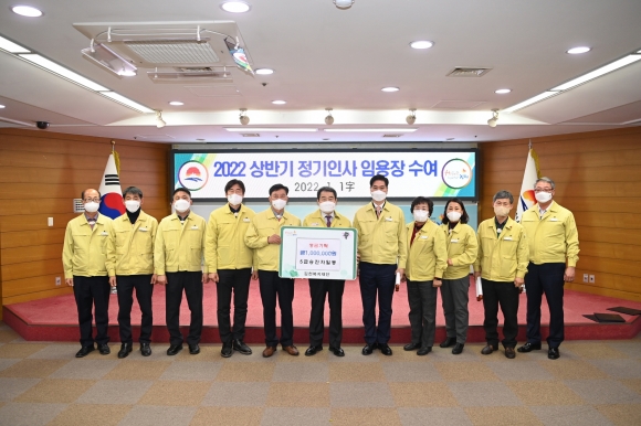 | 김천시 5급 승진자들은 지난 30일 김천시청(시장 김충섭)을 방문하여 김천복지재단으로 이웃돕기성금 100만원을 기탁했다.