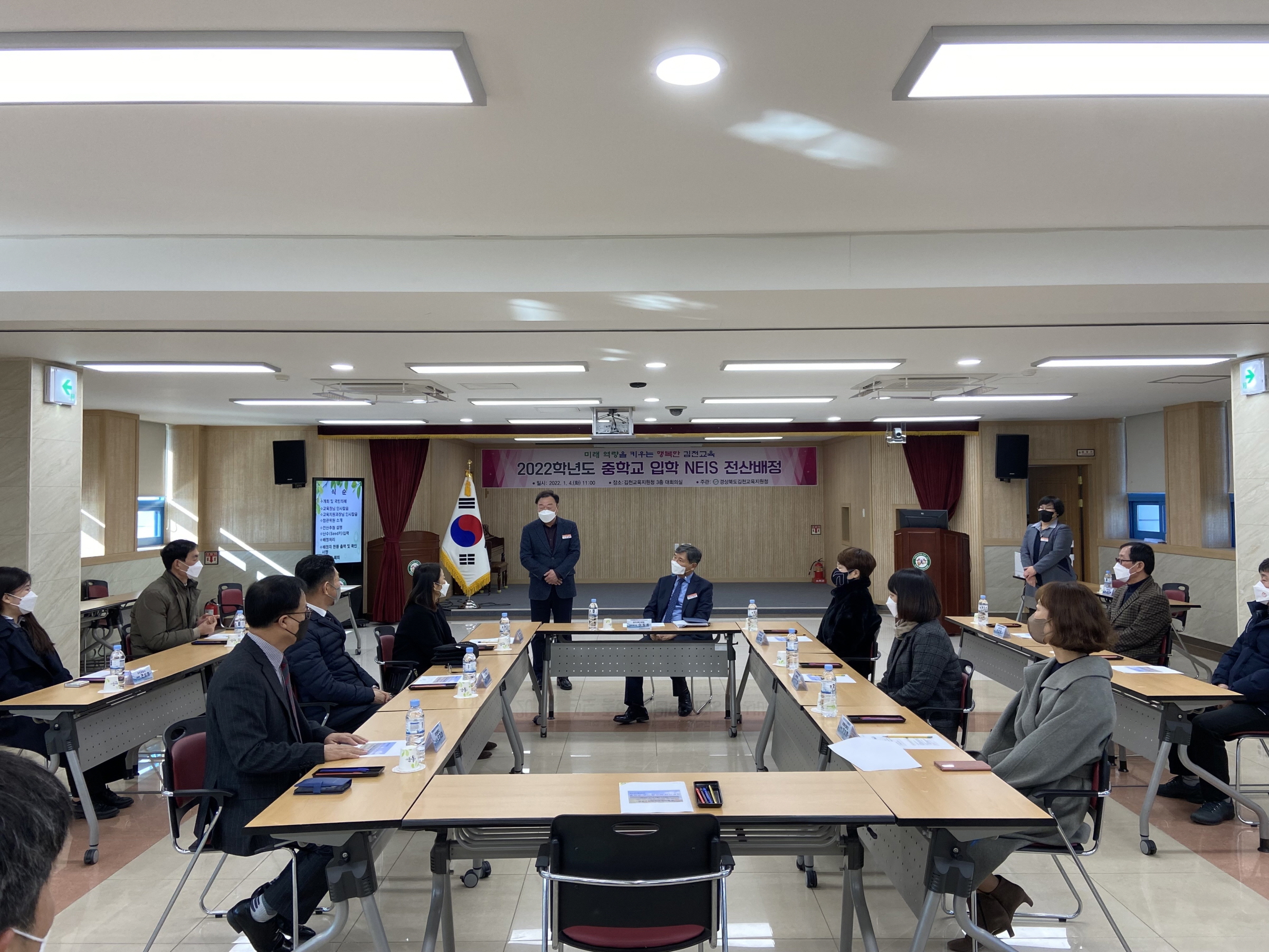 | 김천교육지원청(교육장 박삼봉)은, 2022년 1월 4일에 김천교육지원청 3층 대회의실에서 2022학년도 중학교 입학 예정자 1,053명에 대한 중학교 입학 배정 전산 추첨을 실시하였다.