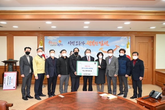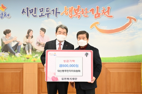 | 대신동행정복지센터(동장 전제등)에서는 지난 1월 4일 김천복지재단에 성금 1천 5백만원을 기탁 했다. 이날 성금은 정광일 대신동체육회장이 1백만원을 쾌척하고 2021년도 해피투게더 김천 운동 추진 우수단체로 선정된 대신동 주민자치위원회(위원장 최규탁)에서 시상금 50만원 전액을 보탰다.