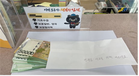 | 김천시 감문면에 거주하는 익명의 기부자가 지난 11일 감문면행정복지센터를 방문하여 어려운 이웃을 위해 사용해 달라며 50만원을 기부했다.