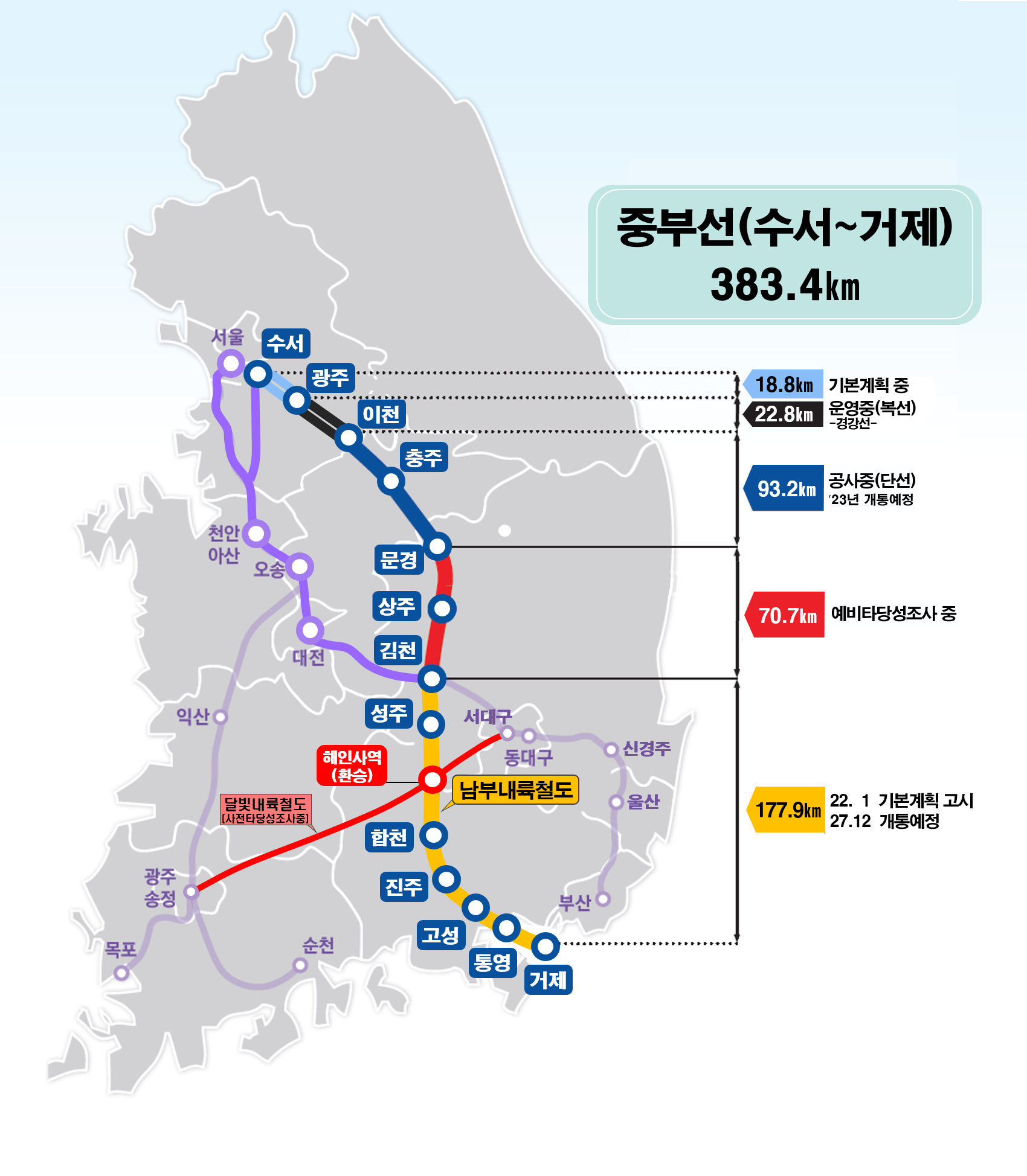 또 수서~광주(기본계획중), 이천~문경(23.12월예정)과 현재 예비타당성조사 중인 문경~김천 철도가 완성되면 중부선 수서~거제간 철도는 수도권과 중남부권을 잇는 명실상부한 한반도 중심축 철도교통망으로 부상하게 된다.